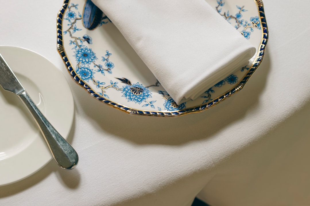 Linen napkins and staff aprons featuring delicate logo embroidery for an acclaimed fine dining establishment. Precision stitching on ivory damask with champagne gold accents.